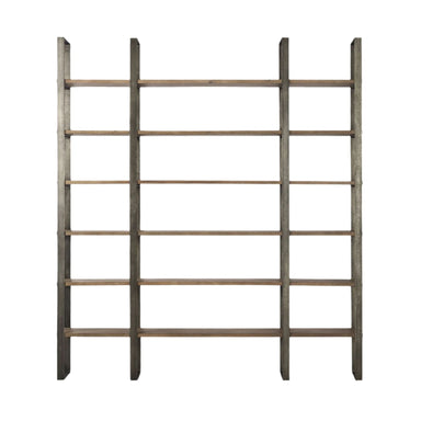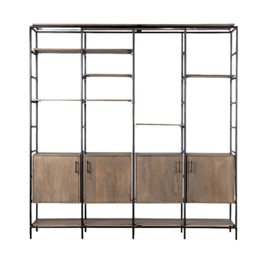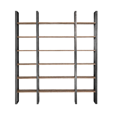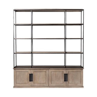 A spectacular shelving unit crafted from wood and metal. It features a mix of re-arrangeable shelves and cabinets braced by a solid iron frame. ...