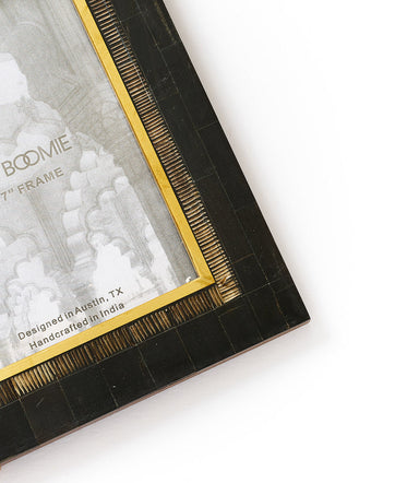 The Andhera 5x7 Black Picture Frame features hand carved black horn with a brass inner frame inlay, in a gold tone finish. The sleek dark combinati...