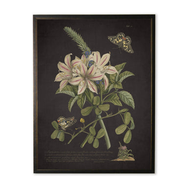 This vintage-inspired print, framed in a copper and black wooden frame, features a sherardia bouquet with two butterflies. Sized at 16 inches by 2...