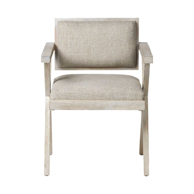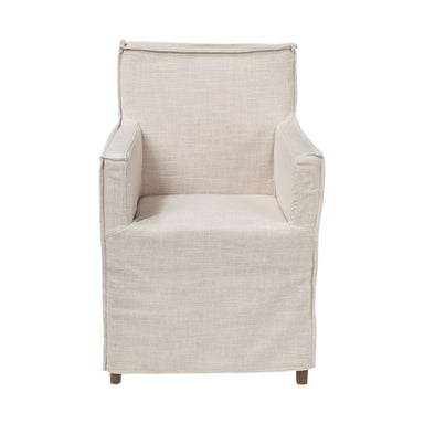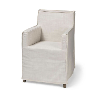 Out with the old and in with the new, this cream and brown slipcovered wood dining arm chair can perfectly suit any dining table. The solid back gi...