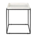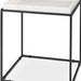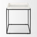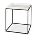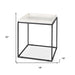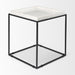 Distinctive in style the 20-inch white and black marble and metal square frame end table radiates a versatile charm. A matte black open geometric metal frame is finished off with a creamy white marble raised edges tray style top that is the epitome of quality construction and design. An ideal location for placing your snacks and drinks, and a place to keep your lamp, frames, or other accessories. This versatile table is a great modern accent for most any room. 20-inch h x 18-inch w x 18-inch d.