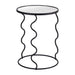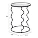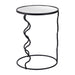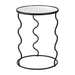 Distinctive in style the 24-inch black mirrored glass and steel round abstract end table radiates a versatile charm. A sleek black monotone color gives this steel and glass table a fresh and updated look. Reflective pieces of mirrored glass give this table a glamorous and unique look. An ideal location for placing your snacks and drinks, and a place to keep your lamp, frames, or other accessories. You can also use it as an entryway table to hold your keys. 24-inch h x 18-inch w x 18-inch d.