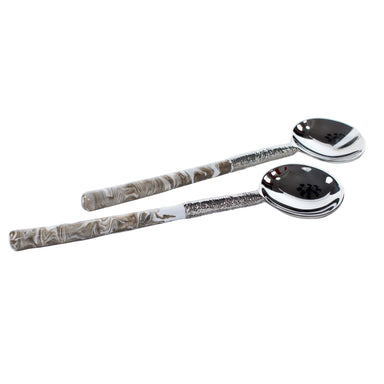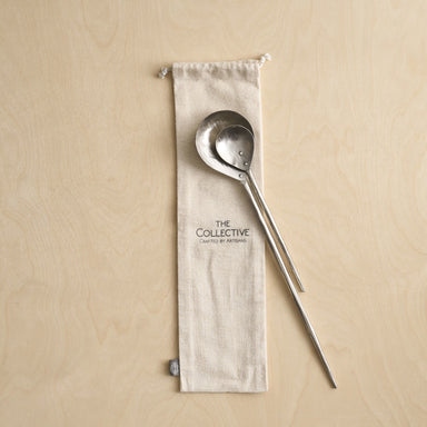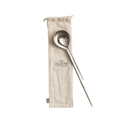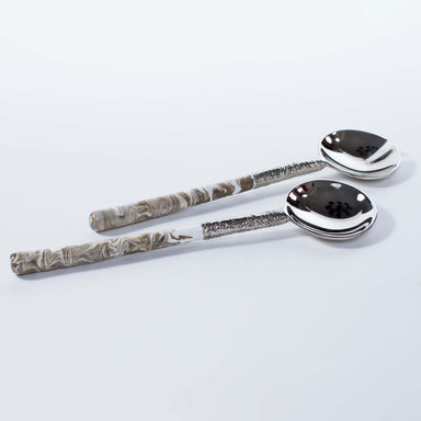 A tidy pair of spoons, made from hammered steel with a matte pewter finish. Set includes one large and one small spoon, designed with an elongated,...