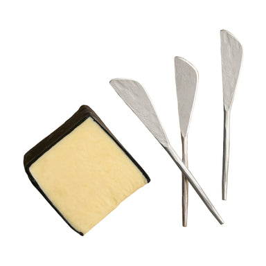 A trio of small, blunt-edged knives. Steel knives with a hammered pewter finish are just what's needed to gently cover bread or crackers with butte...