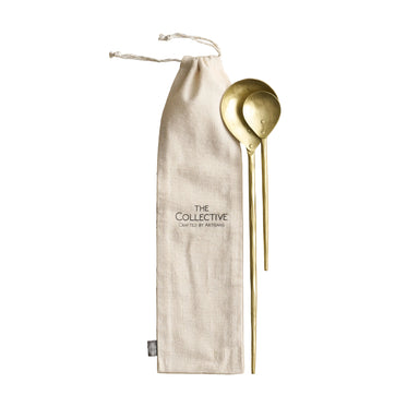 A tidy pair of spoons, made from hammered mild steel with a matte brass finish. Set includes one large and one small spoon, designed with an elonga...