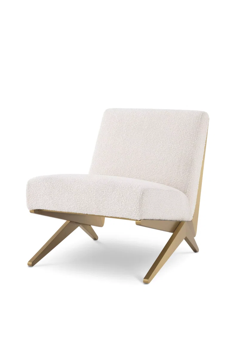 Chair Fico pairs quality with simplicity. This stylish armless lounge chair is a contemporary steel take on wooden minimalist furniture from the 1950s. Featuring a brushed brass finish frame and cream-colored boucle upholstery, it will be a comfortable and stylish addition to your home, whether you use it as a functional seat in your living room or as an accent chair in your bedroom.