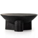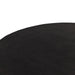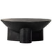 Made from cast aluminum with a raw black finish, a soft, voluminous Y base supports a drum-style tabletop with natural highs and lows.