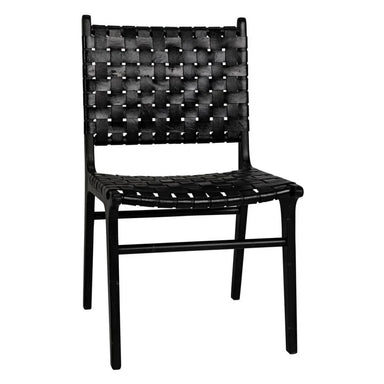Description Thick strips of leather are carefully handwoven around natural teak to create the comfortable seat and back of this armless dining c...