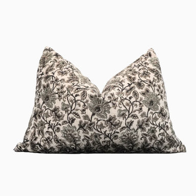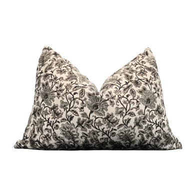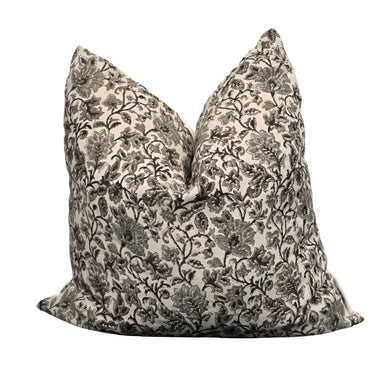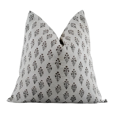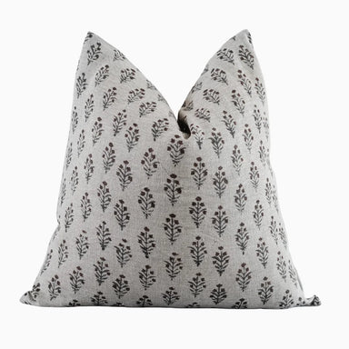 This pillow cover is a gray pattern on a natural linen background. Made in USA. Fabric is hand-block printed in India. 100% off-white heavy weight...