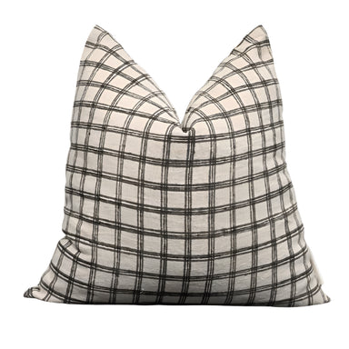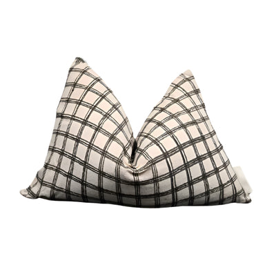 This pillow cover is a black woven stripe on cream cotton background. Made in USA. 100% off-white heavy weight linen back.  Invisible zipper, serge...