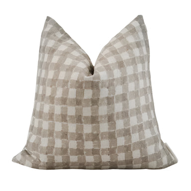 This pillow cover is a tan colored pattern on cream linen background. Made in USA. 100% off-white heavy weight linen back.  Invisible zipper, serge...