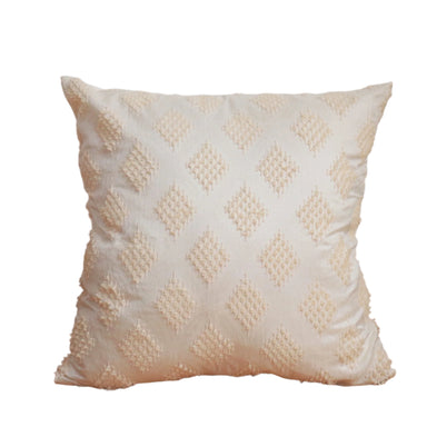 20" Square Cotton Slub Pillow w/ Diamond Embroidery, Tufting & Fringe, Down Fill, Cream Color