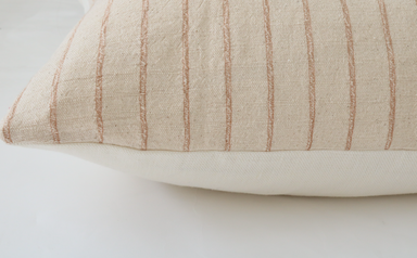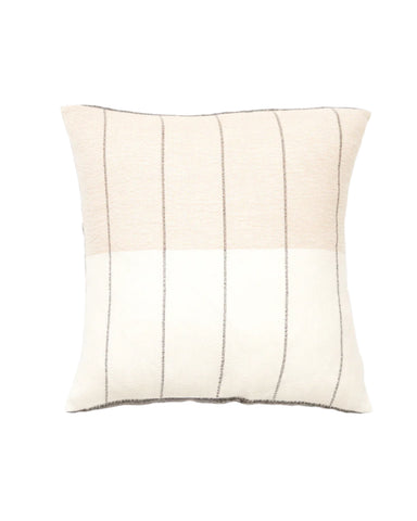This pillow cover is light brown woven stripe on cream cotton background. Made in USA. 100% off-white heavy weight linen back. Invisible zipper, s...