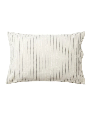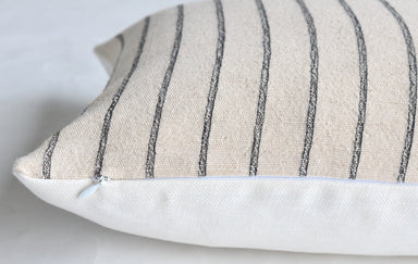 This pillow cover is a black woven stripe on cream cotton background. Made in USA. 100% off-white heavy weight linen back. Invisible zipper, serge...