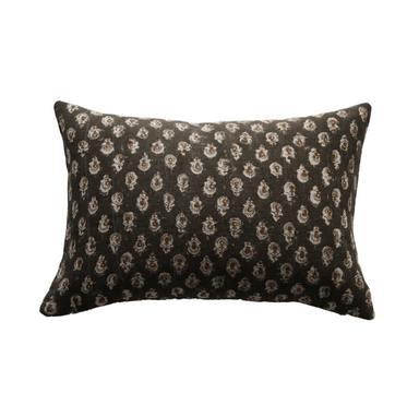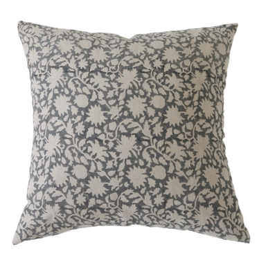 This pillow cover is a gray pattern on a natural linen background. Made in USA. Fabric is hand-block printed in India. 100% off-white heavy weight...
