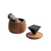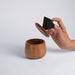 Contemporary round storage box carved from wood and black onyx gemstone. A dreamy accent for your nightstand, vanity or desk to hold jewels, q-tips, airpods and more. The round everything catchall box is a carved using traditional wood carpentry techniques in Magdalena de Cao, Perú. The pyramid-shaped gemstone handle is a geometric element that makes the moment of opening it up feel extra special.