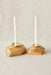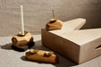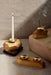 Hand-carved from Knysna Yellowwood, each holder is completely unique in overall shape and arrangement of the facets. The hand-forged brass fitting accommodates standard taper candles and includes a small hole for incense sticks. The wood is meticulously sanded to a fine finish and treated with Danish Furniture Oil, enhancing its rich luster while preserving the natural wood grain. No two pieces are exactly alike, celebrating the ideals of Wabi Sabi, a Japanese aesthetic sensibility that finds beauty in imperfection.