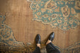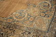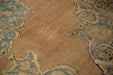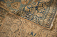 :: Oversized center medallion with scalloped trefoil contour adorned at either end by double tiered finials atop an open abrashed ground with ram's horn scrolled arabesque corner spandrels inwardly directed. Main border in a lotus flower cross-section and meandering vine interconnecting throughout. Colors and shades include: Beige, sand, sandalwood, dusty sky blue, navy blue, antique ivory, pale coffee brown, dusty denim blue, dusty powder blue, and more. Condition notes: Areas of pile, knot heads and foundation. Most of the original side cord selvages are intact or restored. Fully secured sides and ends. One end measures 10'11" whereas the opposing measures 11'3". This variation is within normal margins for hand knotted rugs of this type, age, and size. Some localized areas of professional changes to color. Recently professionally cleaned ready for in-home use! Many years of enjoyment to come with this hand knotted Persian Kerman carpet made in Persia circa 1910's vintage. Size measures 11'3" x 14'2".