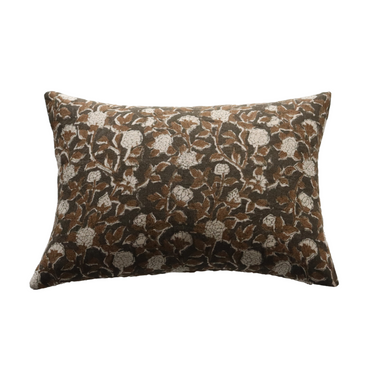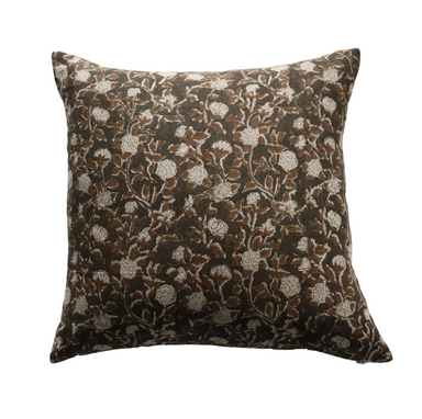 This pillow cover is a gray pattern on a natural linen background. Made in USA. Fabric is hand-block printed in India. 100% off-white heavy weight...