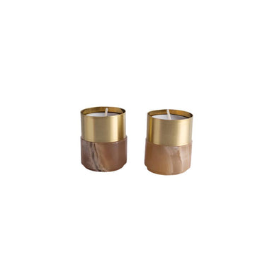 Brass Candle Holder - Amber Alabaster Maker: AndJacob Pair of tea-light candle holder carved in solid alabaster and topped with a satin brass shade...
