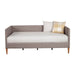 Sink into comfort in the Britney Upholstered Queen Platform Bed. Its clean lines, low profile, and its slightly angled tapered acorn-finished legs raises the bed off the floor for an airy feel that fits right into any mid-century modern styled room. The bed boasts a simple headboard and an upholstered neutral linen finish. The Britney Platform Bed utilizes a combination of poplar and eco-friendly pine solids in its construction and comes complete with a set of slats that is ready to support your mattress and eliminates the need for a box spring.