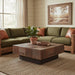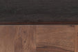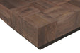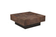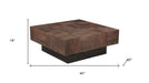 This stylish 40-inch dark brown and black solid wood block coffee table is not only practical, but good looking and built to last. Offering a modern chic two-tone color combination, the thick chunky solid top of this wood table is a warm espresso brown with lots of knots and grains, while the chunky solid base compliments it nicely in black. The purposefully washed and distressed finish gives this table an authentically rustic feel. This modern square table will be a great accent in any room if you're looking for something that can fit into a living area, bedroom, or office, this coffee table is for you. 16-inch h x 40-inch w x 40-inch d.