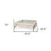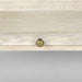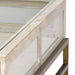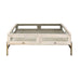 Make your living room or family room really stand out with this 44-inch off white clear and gold solid wood glass and iron storage coffee table. The gold and off white coloration of the high quality metal and solid wood base marries nicely with the clear glass top surface. Featuring a unique shadowbox display design with glass top and two drawers that pull out on either side. Complete with a purposefully distressed finish, this table has an aged, vintage, and rustic feel. This classic rectangular table will be a great accent in any room it has an attractive design that will definitely breathe some fresh air into your interior. 15-inch h x 43.5-inch w x 43.5-inch d.