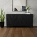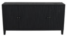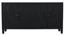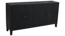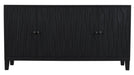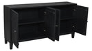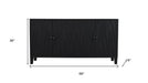 Storage vessels don't have to be unsightly. Increase your storage space and the fashion quotient of your room with this hard wearing, versatile, and good looking cabinet. Crafted from reclaimed wood, this sideboard showcases a stunning graphite finish that adds depth to your decor. The solid wood countertop provides a durable surface for displaying decor items or serving guests. With purposeful distressing techniques like wood scoring and rub through, it has an authentic charm. The satin black hardware beautifully contrasts with the carved geometric detailing, making it a stylish addition to any transitional space while offering ample shelving for organization. 36-inch h x 69-inch w x 16-inch d.