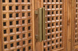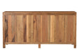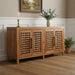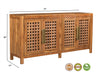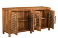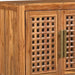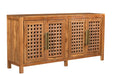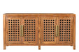 Storage vessels don't have to be unsightly. Increase your storage space and the fashion quotient of your room with this hard wearing, versatile, and good looking cabinet. This sideboard is crafted from solid teak wood, ensuring durability and a timeless appeal. The beautifully carved geometric detailing adds an artistic touch, making it a standout piece in any setting. Its traditional style harmonizes effortlessly with various decor themes. Equipped with shelves, it provides ample space for your essentials, while the rich brown color enhances warmth and elegance in your home. The brass hardware finish complements the overall design beautifully. 36.00-inch h x 71.00-inch w x 17.00-inch d.