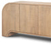 Storage vessels don't have to be unsightly. Increase your storage space and the fashion quotient of your room with this hard wearing, versatile, and good looking cabinet. This modern sideboard is crafted from solid wood, ensuring durability and elegance. Its rich brown color adds warmth to any decor, while the intricate wood scrollwork design on the doors brings a touch of sophistication. Equipped with spacious shelves, it offers ample storage for your essentials, making it both a functional and stylish addition to your home. The sturdy solid wood countertop provides a perfect surface for displaying your favorite decor items. 30-inch h x 72-inch w x 16-inch d.