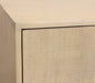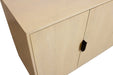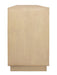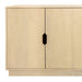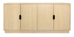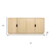 Storage vessels don't have to be unsightly. Increase your storage space and the fashion quotient of your room with this hard wearing, versatile, and good looking cabinet. Crafted from solid wood, this sideboard showcases a contemporary style that enhances any space. The natural color provides a warm and inviting atmosphere, while the carved geometric detailing adds a unique touch. With purposeful distressing techniques such as wood scoring and rub through, each piece boasts character and charm. The satin black hardware complements the overall design, making it a perfect addition to your home decor. Shelves and doors ensure practical storage solutions. 34-inch h x 72-inch w x 20-inch d.