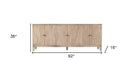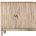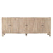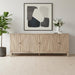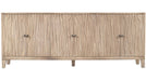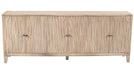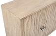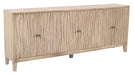 Storage vessels don't have to be unsightly. Increase your storage space and the fashion quotient of your room with this hard wearing, versatile, and good looking cabinet. Crafted from reclaimed wood, this sideboard combines sustainability with style. The ivory color adds a touch of elegance, while the solid wood countertop provides durability. Featuring purposeful distressing with wood scoring and rub through, the sideboard exhibits a unique character. Its carved geometric detailing on both the doors and surface enhances its transitional style, making it a perfect fit for various decor themes. With ample shelves included, organization becomes effortless. 36-inch h x 92-inch w x 16-inch d.
