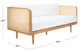 Details: For the daydreamer longing for an afternoon repose, the Helena Rattan Daybed responds with the luxurious look of coastal lifestyle decor. Ivory linen cushions make for a comfort-soft feel while its natural ash frame draw attention to its sublime natural-toned French cane sides and back. This daybed is the perfect piece for adding breezy style to fashionable décor.