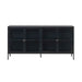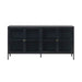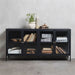 Details: Enjoy a more refined take on the modern design aesthetic with this metal and glass sideboard. This metal four door cabinet is designed with four glass panel door fronts, two shelves, and simple black metal framework, making it the perfect home for your favorite pottery, books, and other collected curiosities. The design is timeless and complements any range, color or texture so feel free to mix it up with both natural wooden colors, darker smoked stains and bold colors from fabrics or simply use it as a stand-alone statement piece. The cabinet has five year commercial warranty.
