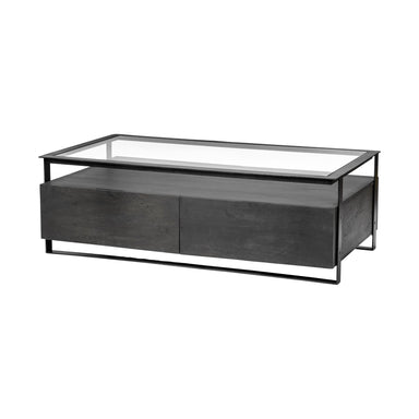 Make your living room or family room really stand out with this 30" clear black glass rectangular coffee table with four drawers and shelf. The cle...