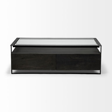 This stylish 56-inch brown and black solid wood and metal coffee table with three drawers is not only practical, but good looking and built to last...