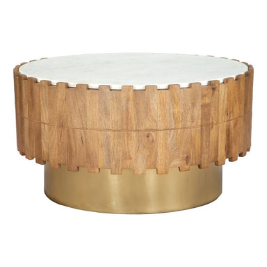 This stylish 31-inch gold natural and white iron wood and faux marble round block coffee table is sure to inspire compliments no matter where it si...