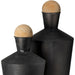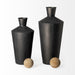 Enhance your modern décor with this set of two black and brown metal cylindrical urns. The two bottles in this set are two different sizes and are made from solid metal, with a distressed matte black finish that gives them a modern look. The tops feature a round solid wood ball as the stopper that can be left on or removed as you choose. 18.5-inch H x 7.48-inch W x 7.48-inch D