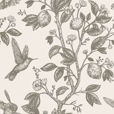 Indulge in timeless sophistication with this luxury vintage wallpaper, featuring hand illustrated hummingbirds, delicate citrus branches with lemon...