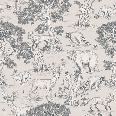 Bring the charm of nature into your space with this woodland animals toile wallpaper, featuring intricately hand-drawn wildlife including deer, fox...