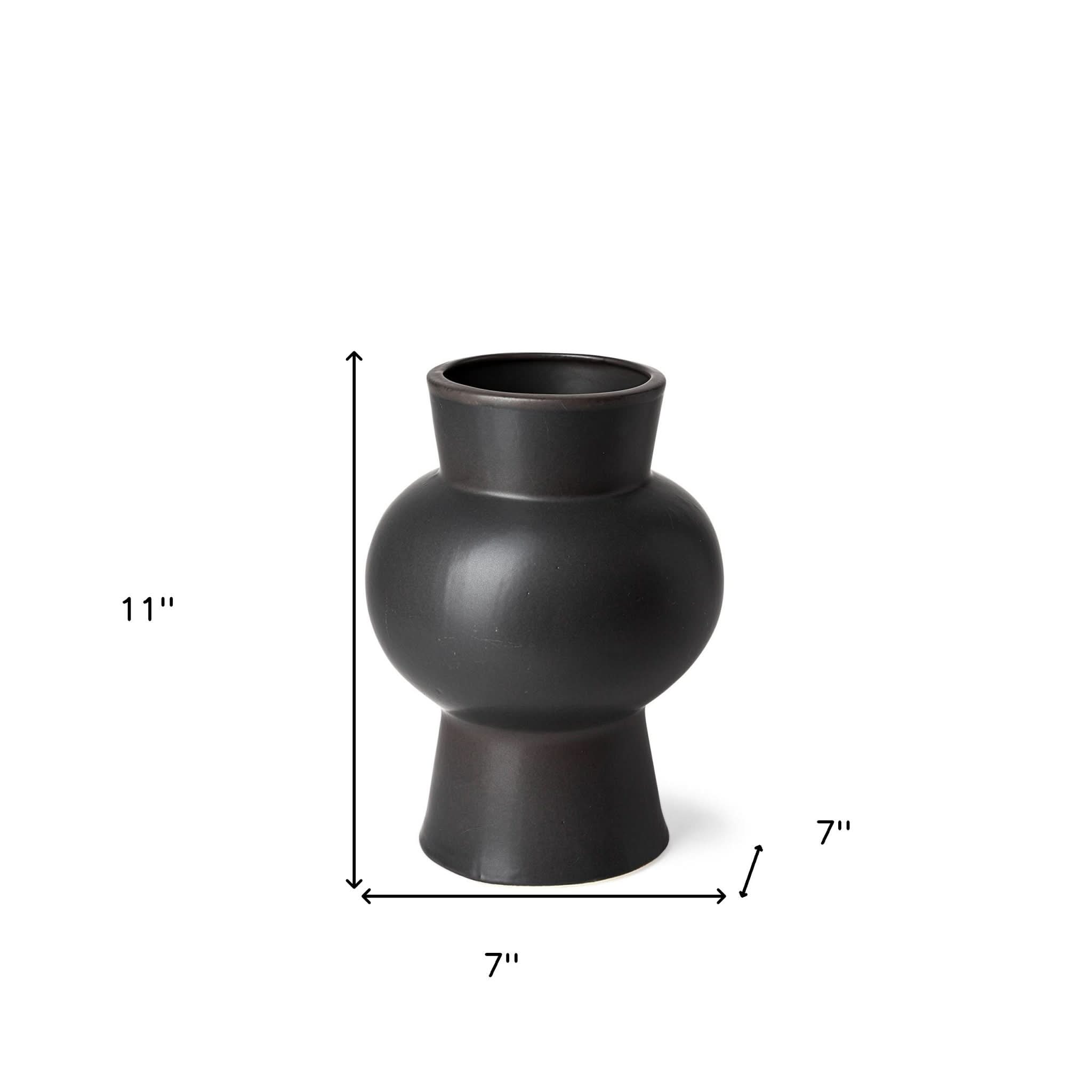 This Black Ceramic Vase is the perfect way to add a touch of contemporary design to any space in your home. This vase is made from ceramic and has a semi-matte black finish on it. There are an upside down conical shape that acts as the base with a circular shape acting as the body. The top has the same conical shape that is a little shorter than the base. This unique vase will make your floral arrangements pop even more owing to its dark neutral color. You can also use it as a decor piece anywhere in your home. 11" H x 7" W x 7" D